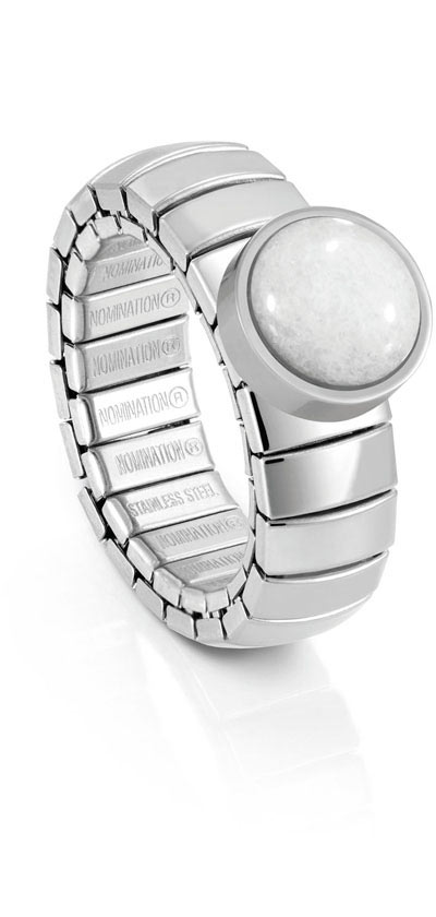 Nomination Grace sormus 043602/028. Sormus on valmistettu ruostumattomasta teräksestä. Sormus on yhden koon malli ja venyy tarvittavaan mittaan. Sormuksessa on valkoinen jade. Toimitetaan valmistajan alkuperäisessä lahjarasiassa postikuluitta!