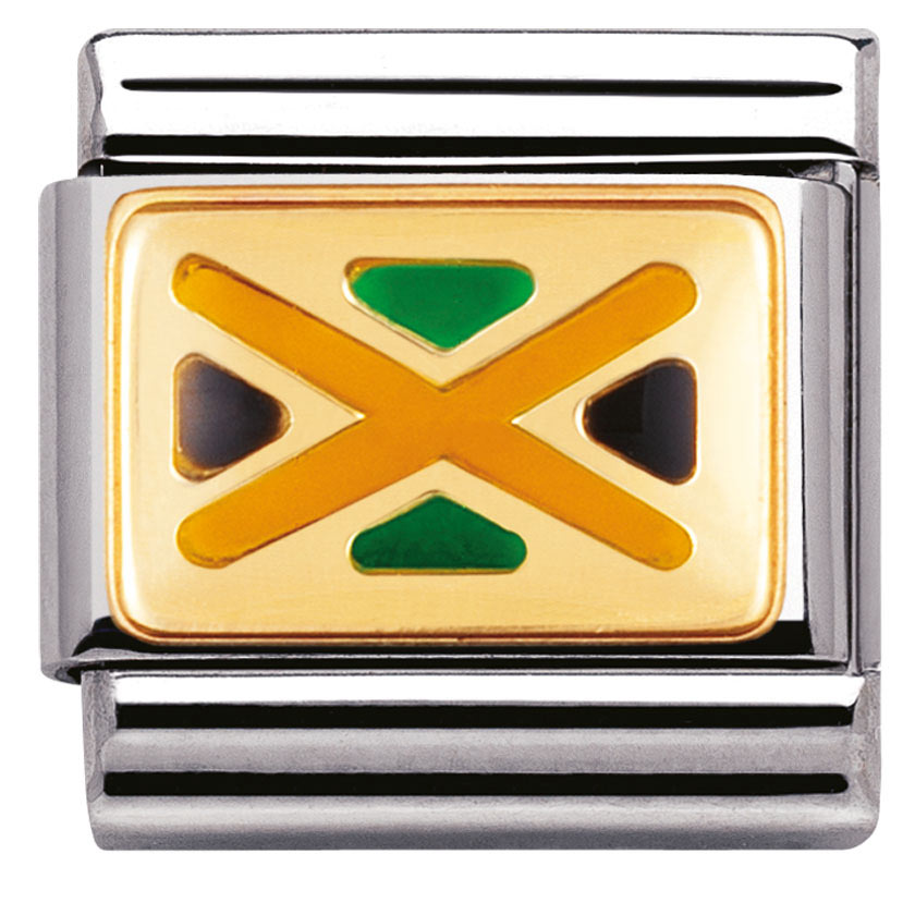 Nomination Jamaikan lippu 030235-16. Lippupalat ovat esimerkiksi hauskoja muistoja maista, joissa olet vieraillut tai maista joita rakastat. Nomination palat ovat valmistettu laadukkaasta ruostumattomasta teräksestä ja 18k kullasta. Palojen värikäät kohdat ovat emalia. Nomination paloille myönnetään kahden vuoden takuu ja ne toimitetaan valmistajan alkuperäisessä pakkauksessa.