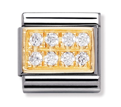 Nomination kirkas pave 030314-01. Nomination kivelliset palat ovat valmistettu laadukkaasta ruostumattomasta teräksestä ja 18k kullasta. Lisäksi niihin on istutettu synteettisiä Zirconia korukiviä. Nomination paloille myönnetään 2 vuoden takuu, ja ne toimitetaan valmistajan omassa rasiassa.