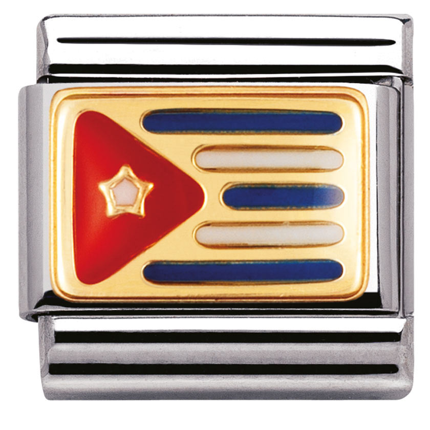 Nomination Kuuban lippu 030235-07. Lippupalat ovat esimerkiksi hauskoja muistoja maista, joissa olet vieraillut tai maista joita rakastat. Nomination palat ovat valmistettu laadukkaasta ruostumattomasta teräksestä ja 18k kullasta. Palojen värikäät kohdat ovat emalia. Nomination paloille myönnetään kahden vuoden takuu ja ne toimitetaan valmistajan alkuperäisessä pakkauksessa.