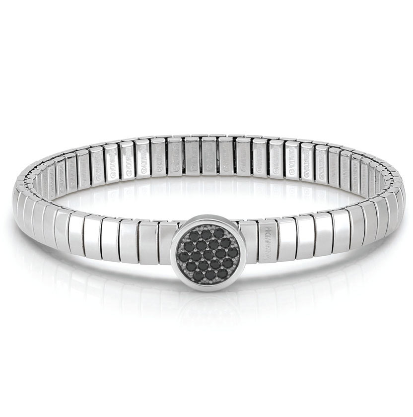 Nomination Lotus rannekoru 043111/011. Rannekoru on valmistettu ruostumattomasta teräksestä ja on yhden koon rannekoru, joka venyy tarvittavaan mittaan. Korussa 19 mustaa zirkonia. Korun leveys 7mm. Toimitetaan valmistajan alkuperäisessä rasiassa postikuluitta!