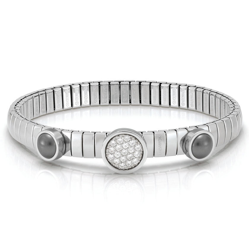 Nomination Lotus rannekoru 043113/014. Rannekoru on valmistettu ruostumattomasta teräksestä ja on yhden koon rannekoru, joka venyy tarvittavaan mittaan. Korussa 19 kirkasta zirkonia ja kaksi harmaata helmeä. Korun leveys 7mm. Toimitetaan valmistajan alkuperäisessä rasiassa postikuluitta!