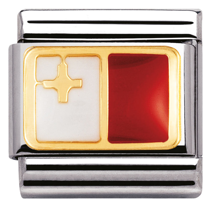 Nomination Classic sarjan Maltan lippu -pala 030234-29. Lippupalat ovat hauskoja muistoja maista, joissa olet vieraillut ja maista joita rakastat. Maltan lippu pala on valmistettu ruostumattomasta teräksestä ja 18k kullasta. Palan värikkäät yksityiskohdat ovat emalia. Nomination paloille myönnetään kahden vuoden takuu ja ne toimitetaan valmistajan alkuperäisessä pakkauksessa.