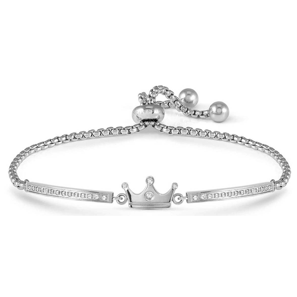 Nomination Milleluci Refined 028016/039 rannekoru on valmistettu hopeasta ja siinä on koristeena näyttävä kruunu-hela. Kruunu ja sen viereiset laatat on koristeltu kirkkailla zirkonioilla. Pituus 19 cm ja säätöväli 14 cm. Helan koko 1,2 x 0,7 cm. Italialaiset Nomination-korut toimitetaan valmistajan kauniissa rasiassa.