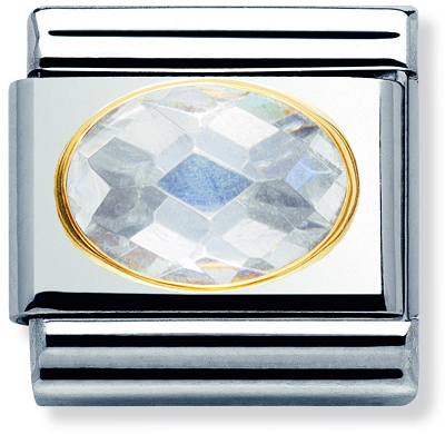 Nomination ovaali kirkas Zirconia 030601-010. Nomination palat ovat valmistettu laadukkaasta ruostumattomasta teräksestä ja 18k kullasta. Lisäksi palaan on istutettu synteettinen kirkas Zirconia korukivi. Nomination paloille myönnetään 2 vuoden takuu, ja ne toimitetaan valmistajan omassa rasiassa.