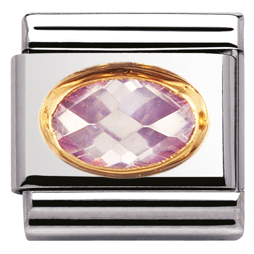 Nomination ovaali laventeli Zirconia 030601-023. Nomination palat ovat valmistettu laadukkaasta ruostumattomasta teräksestä ja 18k kullasta. Lisäksi palaan on istutettu synteettinen laventelin värinen Zirconia korukivi. Nomination paloille myönnetään 2 vuoden takuu, ja ne toimitetaan valmistajan omassa rasiassa.