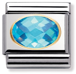 Nomination ovaali vaaleansininen Zirconia 030601-006. Nomination palat ovat valmistettu laadukkaasta ruostumattomasta teräksestä ja 18k kullasta. Lisäksi palaan on istutettu synteettinen vaaleansininen Zirconia korukivi. Nomination paloille myönnetään 2 vuoden takuu, ja ne toimitetaan valmistajan omassa rasiassa.
