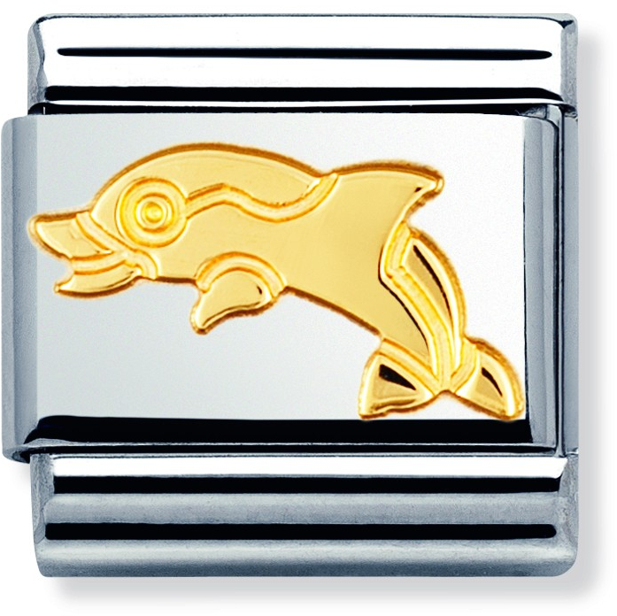 Nomination delfiini 030113-04. Nomination palat ovat valmistettu laadukkaasta ruostumattomasta teräksestä ja 18k kullasta. Nomination paloille myönnetään kahden vuoden takuu ja ne toimitetaan valmistajan omassa rasiassa!