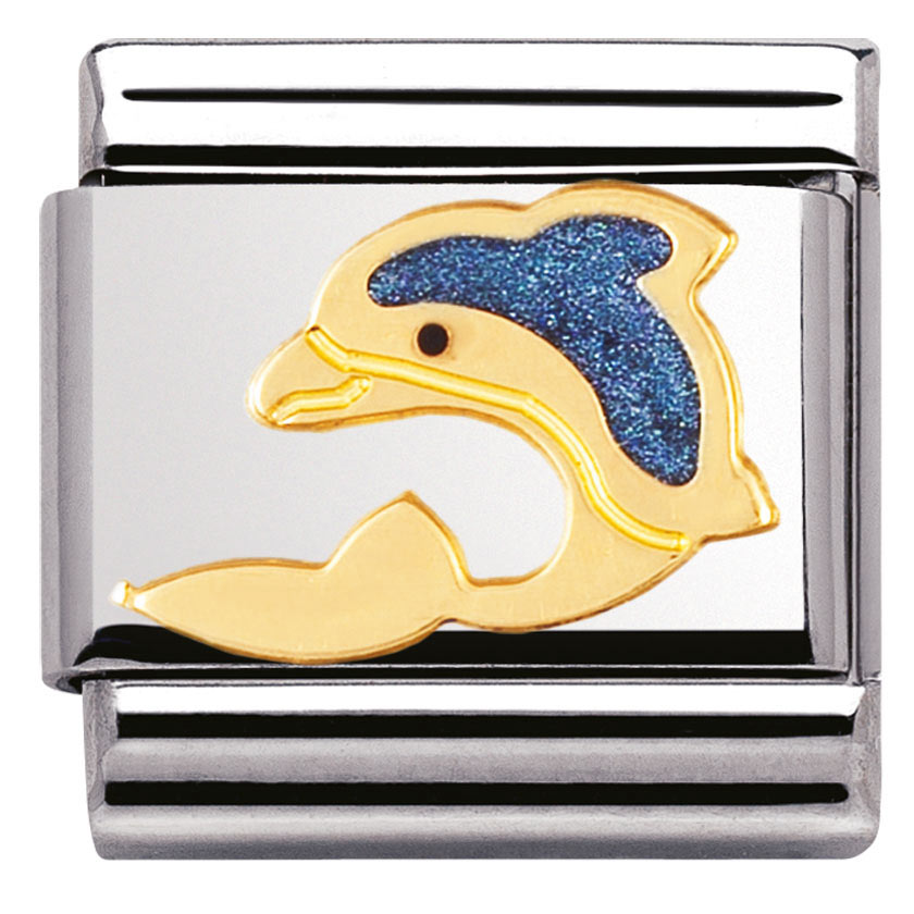 Nomination delfiini 030213-01. Nomination palat ovat valmistettu laadukkaasta ruostumattomasta teräksestä ja 18k kullasta. Palojen värikäät kohdat ovat emalia. Nomination paloille myönnetään kahden vuoden takuu ja ne toimitetaan valmistajan omassa rasiassa.