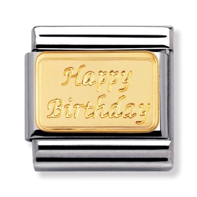 Nomination Happy Birthday 030121-09. Nomination palat ovat valmistettu laadukkaasta ruostumattomasta teräksestä ja 18k kullasta. Nomination paloille myönnetään kahden vuoden takuu ja ne toimitetaan valmistajan omassa rasiassa!