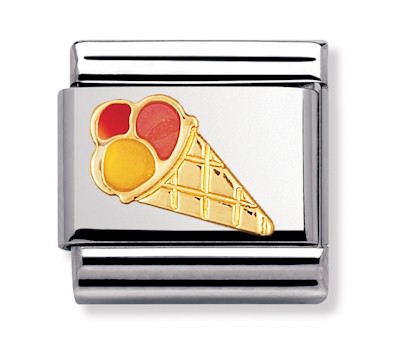 Nomination jäätelötuutti 030209-30. Nomination palat ovat valmistettu laadukkaasta ruostumattomasta teräksestä ja 18k kullasta. Palojen värikäät kohdat ovat emalia. Nomination paloille myönnetään kahden vuoden takuu ja ne toimitetaan valmistajan omassa rasiassa.