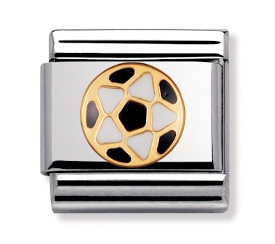 Nomination jalkapallo 030204-17. Nomination palat ovat valmistettu laadukkaasta ruostumattomasta teräksestä ja 18k kullasta. Palojen värit ovat emalia. Nomination paloille myönnetään kahden vuoden takuu ja ne toimitetaan valmistajan omassa rasiassa.