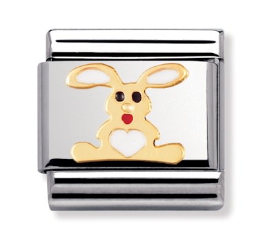 Nomination jänis 030212-02. Nomination palat ovat valmistettu laadukkaasta ruostumattomasta teräksestä ja 18k kullasta. Palojen värikäät kohdat ovat emalia. Nomination paloille myönnetään kahden vuoden takuu ja ne toimitetaan valmistajan omassa rasiassa.