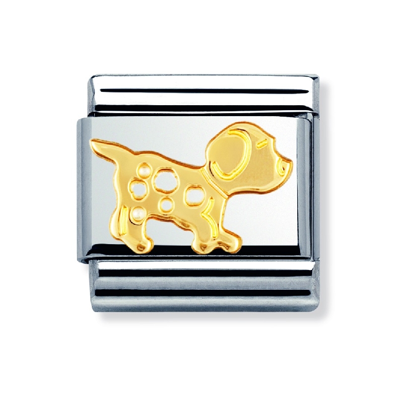 Nomination koira 030112-23. Nomination palat ovat valmistettu laadukkaasta ruostumattomasta teräksestä ja 18k kullasta. Nomination paloille myönnetään kahden vuoden takuu ja ne toimitetaan valmistajan omassa rasiassa.