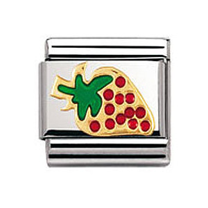 Nomination mansikka 030215-11. Nomination palat ovat valmistettu laadukkaasta ruostumattomasta teräksestä ja 18k kullasta. Palojen värikäät kohdat ovat emalia. Nomination paloille myönnetään kahden vuoden takuu ja ne toimitetaan valmistajan omassa rasiassa.