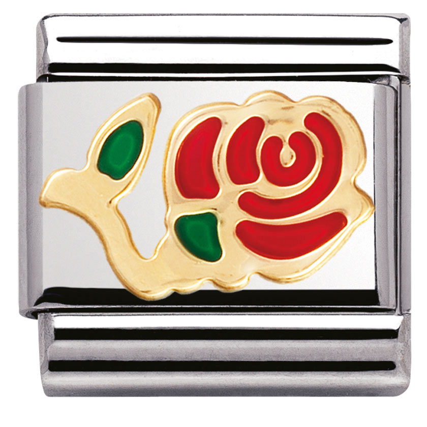 Nomination ruusu 030214-01. Nomination palat ovat valmistettu laadukkaasta ruostumattomasta teräksestä ja 18k kullasta. Palojen värikäät kohdat ovat emalia. Nomination paloille myönnetään kahden vuoden takuu ja ne toimitetaan valmistajan omassa rasiassa.