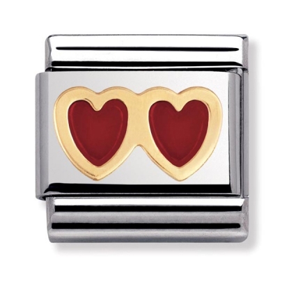 Nomination sydämet 030207-02. Nomination palat ovat valmistettu laadukkaasta ruostumattomasta teräksestä ja 18k kullasta. Palojen värit ovat emalia. Nomination paloille myönnetään kahden vuoden takuu ja ne toimitetaan valmistajan omassa rasiassa.