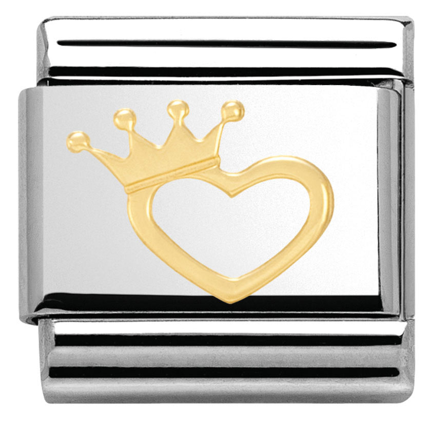 Nomination sydän ja kruunu 030116/17. Nomination palat ovat valmistettu laadukkaasta ruostumattomasta teräksestä ja 18k kullasta. Nomination paloille myönnetään kahden vuoden takuu ja ne toimitetaan valmistajan omassa rasiassa.