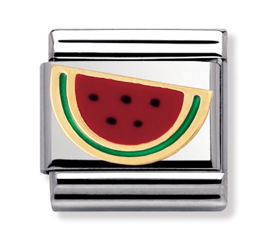 Nomination vesimeloni 030215-14. Nomination palat ovat valmistettu laadukkaasta ruostumattomasta teräksestä ja 18k kullasta. Palojen värikäät kohdat ovat emalia. Nomination paloille myönnetään kahden vuoden takuu ja ne toimitetaan valmistajan omassa rasiassa.