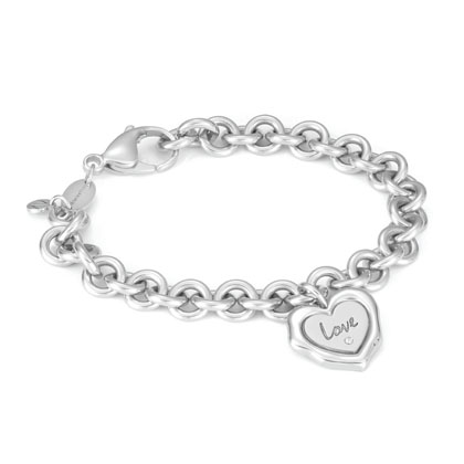 Nomination Poesia rannekoru 025110/014. Rannekoru on valmistettu ruostumattomasta teräksestä ja sen pituus on 21cm. Korussa Swarovskin zirkoni. Sydänhelan suurin halkaisija 19mm. Toimitetaan valmistajan alkuperäisessä rasiassa postikuluitta!