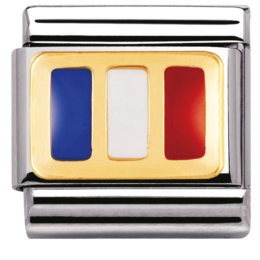 Nomination Ranskan lippu 030234-05. Lippupalat ovat esimerkiksi hauskoja muistoja maista, joissa olet vieraillut tai maista joita rakastat. Nomination palat ovat valmistettu laadukkaasta ruostumattomasta teräksestä ja 18k kullasta. Palojen värikäät kohdat ovat emalia. Nomination paloille myönnetään kahden vuoden takuu ja ne toimitetaan valmistajan alkuperäisessä pakkauksessa.