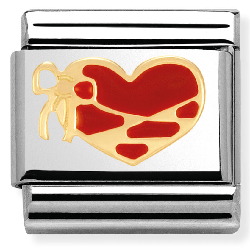 Nomination sydän ja rusetti 030253/38. Nomination palat ovat valmistettu laadukkaasta ruostumattomasta teräksestä ja 18k kullasta. Palan värikkäät kohdat ovat emalia. Nomination paloille myönnetään kahden vuoden takuu ja ne toimitetaan valmistajan omassa rasiassa.