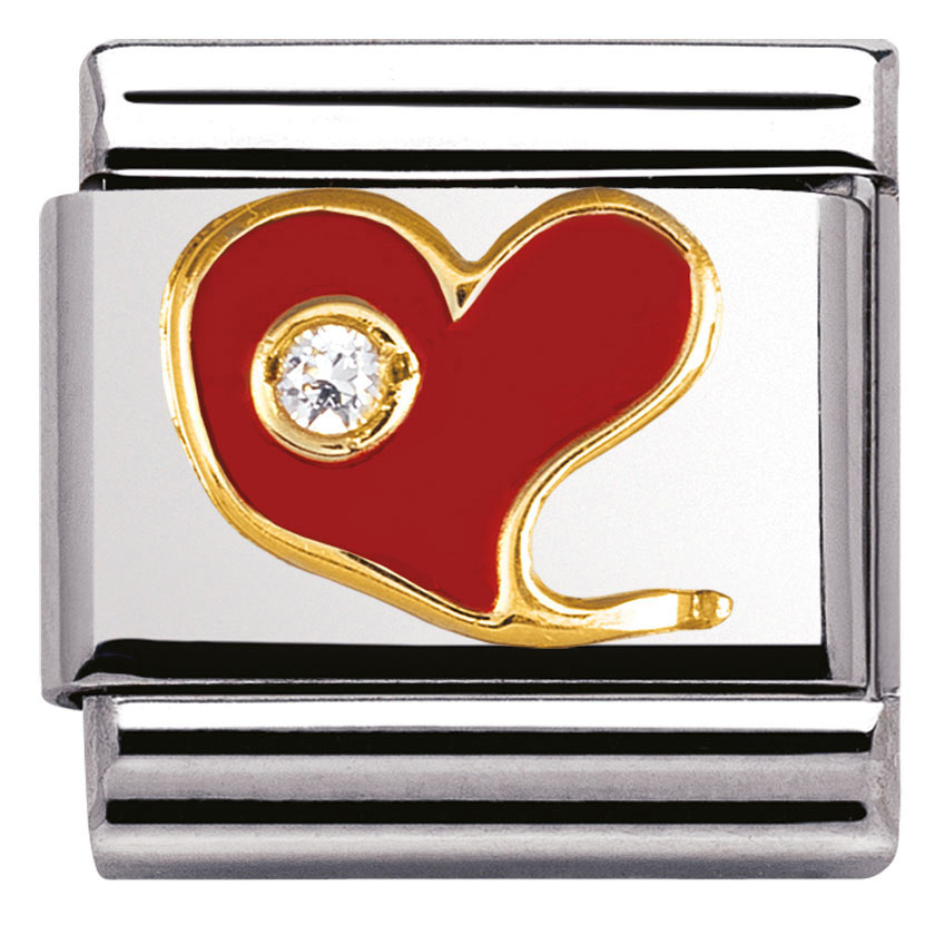 Nomination sydän kivellä 030321-21. Nomination kivelliset palat ovat valmistettu laadukkaasta ruostumattomasta teräksestä ja 18k kullasta. Lisäksi niihin on istutettu synteettisiä Zirconia korukiviä. Värilliset kohdat ovat emaloituja. Nomination paloille myönnetään 2 vuoden takuu, ja ne toimitetaan valmistajan omassa rasiassa.
