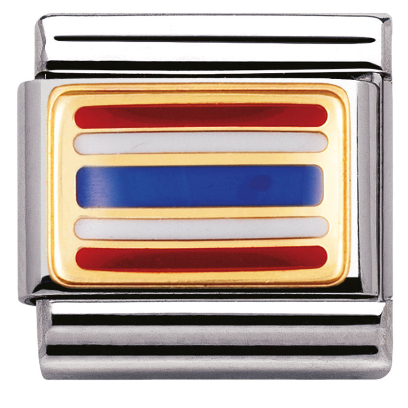 Nomination Thaimaan lippu 030236-10. Lippupalat ovat esimerkiksi hauskoja muistoja maista, joissa olet vieraillut tai maista joita rakastat. Nomination palat ovat valmistettu laadukkaasta ruostumattomasta teräksestä ja 18k kullasta. Palojen värikäät kohdat ovat emalia. Nomination paloille myönnetään kahden vuoden takuu ja ne toimitetaan valmistajan alkuperäisessä pakkauksessa.