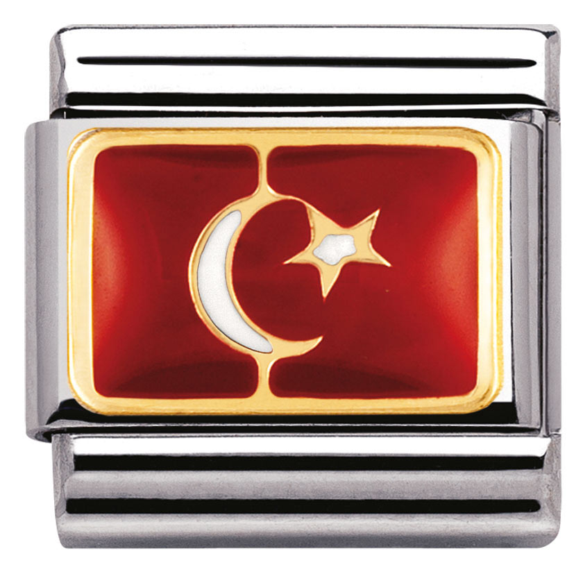 Nomination Turkin lippu 030234-20. Lippupalat ovat esimerkiksi hauskoja muistoja maista, joissa olet vieraillut tai maista joita rakastat. Nomination palat ovat valmistettu laadukkaasta ruostumattomasta teräksestä ja 18k kullasta. Palojen värikäät kohdat ovat emalia. Nomination paloille myönnetään kahden vuoden takuu ja ne toimitetaan valmistajan alkuperäisessä pakkauksessa.