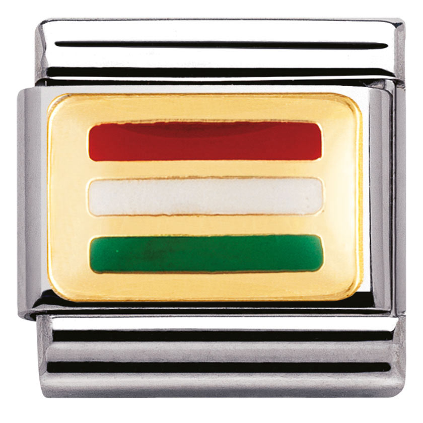Nomination Unkarin lippu 030234-28. Lippupalat ovat esimerkiksi hauskoja muistoja maista, joissa olet vieraillut tai maista joita rakastat. Nomination palat ovat valmistettu laadukkaasta ruostumattomasta teräksestä ja 18k kullasta. Palojen värikäät kohdat ovat emalia. Nomination paloille myönnetään kahden vuoden takuu ja ne toimitetaan valmistajan alkuperäisessä pakkauksessa.