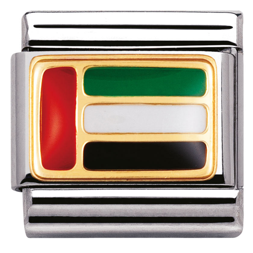 Nomination Yhdistyneiden Arabiemiraattien lippu 030236-15. Lippupalat ovat esimerkiksi hauskoja muistoja maista, joissa olet vieraillut tai maista joita rakastat. Nomination palat ovat valmistettu laadukkaasta ruostumattomasta teräksestä ja 18k kullasta. Palojen värikäät kohdat ovat emalia. Nomination paloille myönnetään kahden vuoden takuu ja ne toimitetaan valmistajan alkuperäisessä pakkauksessa.