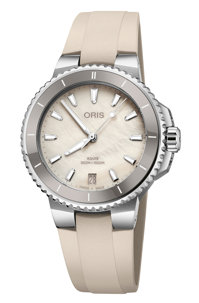 Suunnittelussa on panostettu äärimmäiseen selkeälukuisuuteen: uudistetut Alpha-osoittimet ja kilpimäiset tuntimerkinnät on muotoiltu peilaamaan toisiaan, mikä takaa ajan nopean lukemisen yhdellä silmäyksellä. Vaalea keraaminen kehä ja siihen sointuva kuminen ranneke tekevät kellosta urheilullisen ja erittäin miellyttävän ranteessa. Oris Aquis Date on osa Oriksen "Change for the Better" -missiota, ja se on kello sinulle, joka vaadit asusteeltasi sekä eettistä arvopohjaa että markkinoiden parasta sveitsiläistä laatua.