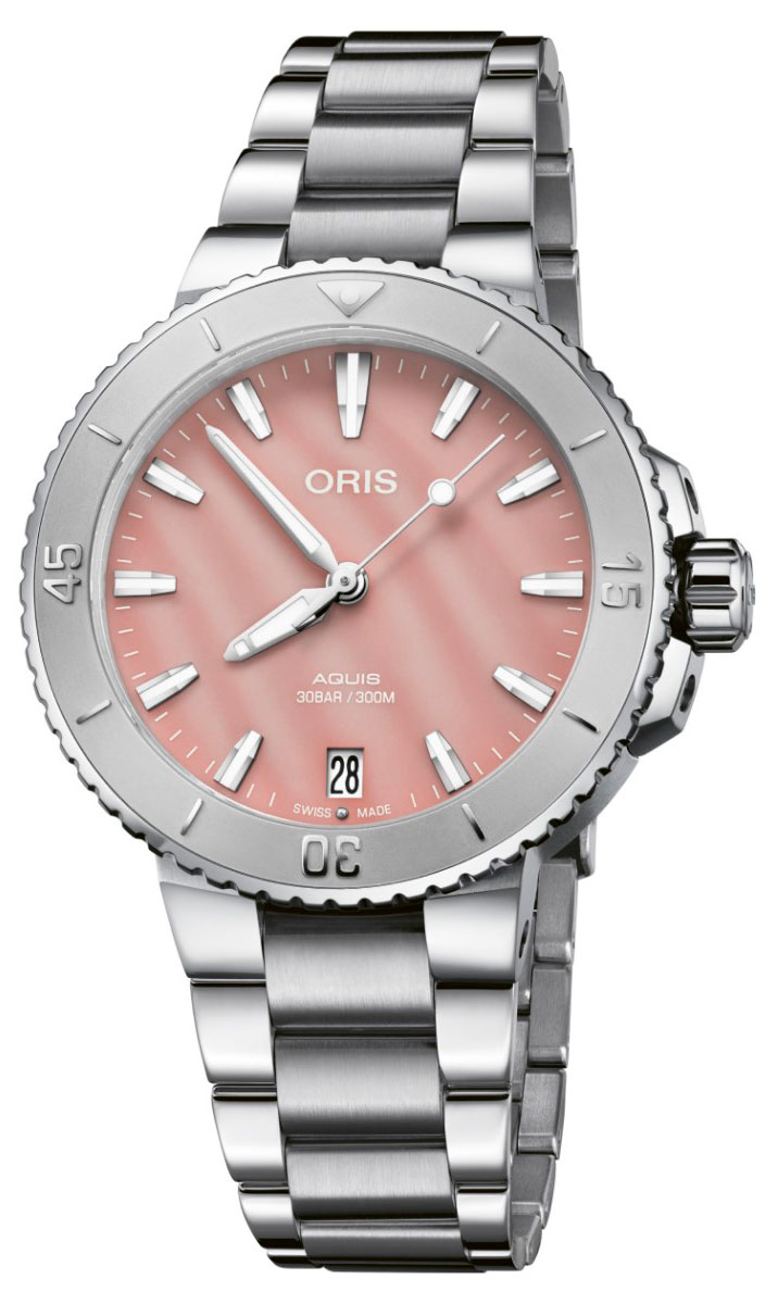 Oris Aquis Date 01 733 7770 4158-07 8 18 05P naisten automaattikello on valmistettu huippuluokan Oris-kellonvalmistusteknologialla, jonka 36,5 mm leveä runko on ruostumatonta terästä, ja kimaltavalle vaaleanpunaiselle kellotaululle kaunista vastapainoa antaa yhteen suuntaan pyörivä, harjattu, matta teräsbezel. Kellossa on luminoituvat valkoiset indeksit ja osoittimet sekä suuri päivämääränäyttö löytyy kello kuudesta. Taulua suojaa huurteenestolla varustettu safiirilasi. Kello on varustettu Oris 733-automaattikoneistolla, mikä antaa 38 tunnin käyntivaran. Läpinäkyvän takakannen läpi voit ihastella automaattikoneiston käyntiä. Kello kuuluu vesitiiviysluokkaan 300 m / 30 atm, joten se soveltuu hyvin esimerkiksi syväsukellukseen ja ammattimaiseen sukelluskäyttöön.