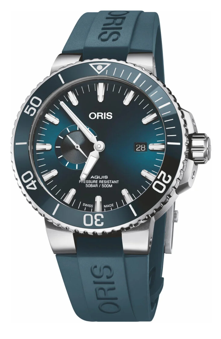 Oris Aquis Small Second Date 01 743 7733 4155-07 4 24 69EB on näyttävä ja ylellinen sukeltajankello, ja täydellinen lisä urheilulliseen tyyliin. Tuttua Oris-teknologoaa sisältävässä kellossa on Oris 743 -automaattikoneisto, jossa on 38 tunnin käyntivara. Kellon sinivihreässä fumè -kellotaulussa on päivämääränäyttö kello 3:00 ja sekuntiosoitin kello 9:00. Teräsrungon on halkaisijaltaan 45,5 mm, ja yhteen suuntaan pyörivässä bezelissä on keraaminen insertti. Kokonaisuuden viimeistelee silikoniranneke, jossa on Oriksen patentoitu lukko, sekä huurteenestolla varustettu, hieman kupera safiirilasi. Oris Aquis Small Second Date 01 743 7733 4155-07 4 24 69EB-sukeltajankellolle myönnetään 2 vuoden takuu, jonka voit pidentää MyOris-palvelussakolmeksi vuodeksi. Oris-kellot toimitetaan valmistajan alkuperäisessä pakkauksessa.