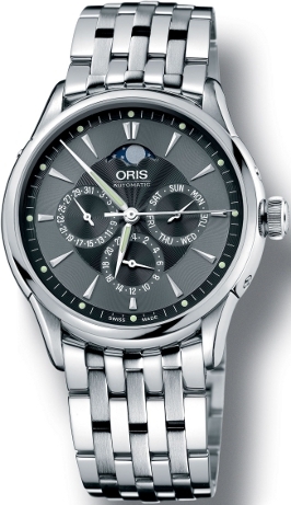 Oris Artelier 01 581 7592 4054-07 8 21 73 rannekello, jossa Automaatti koneisto Oris 581. Kellon runko on leveydeltään 40mm ja ranneke 21mm. Kellolle myönnetään kahden vuoden takuu ja se toimitetaan valmistajan alkuperäisessä rasiassa postikuluitta!