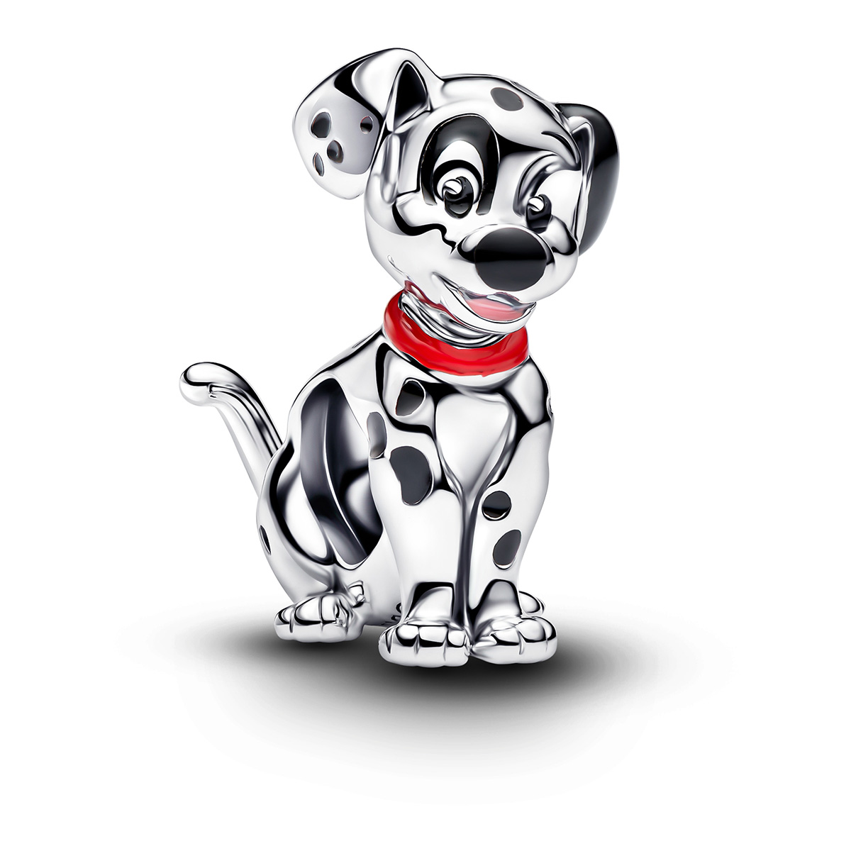 Hela on valmistettu kiiltävästä sterling-hopeasta ja viimeistelty huolellisesti käsityönä, mikä tuo esiin sen tarkat muodot ja viimeistellyn pinnan. Pennun tunnistettava ilme korostuu kontrastisilla mustilla ja kaulapannan punaisilla emaliyksityiskohdilla, jotka lisäävät koruun syvyyttä ja elävyyttä. Muotoilussa on käytetty tarkoituksella hieman suurennettua päätä ja pienempää vartaloa, mikä tekee hahmosta erityisen ilmeikkään ja leikkisän, juuri kuten elokuvassa. Mitat: Syvyys 14 mm, korkeus 15 mm ja leveys 7,9 mm.