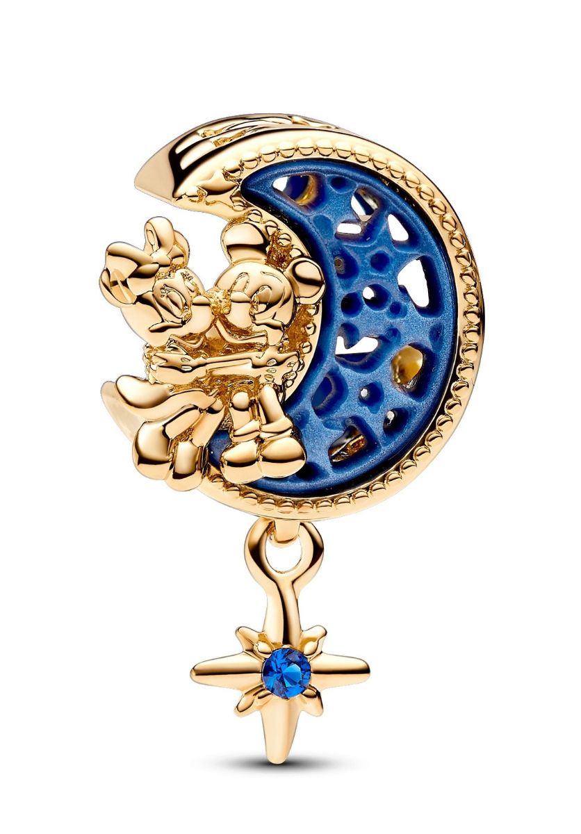 Pandora Disney x Pandora Mouse Crescent Moon 14k Gold-plated hela 762956C01 on Mikki ja Minni istumassa kuunspirpillä. Korussa on 14 karaatin kultaus.