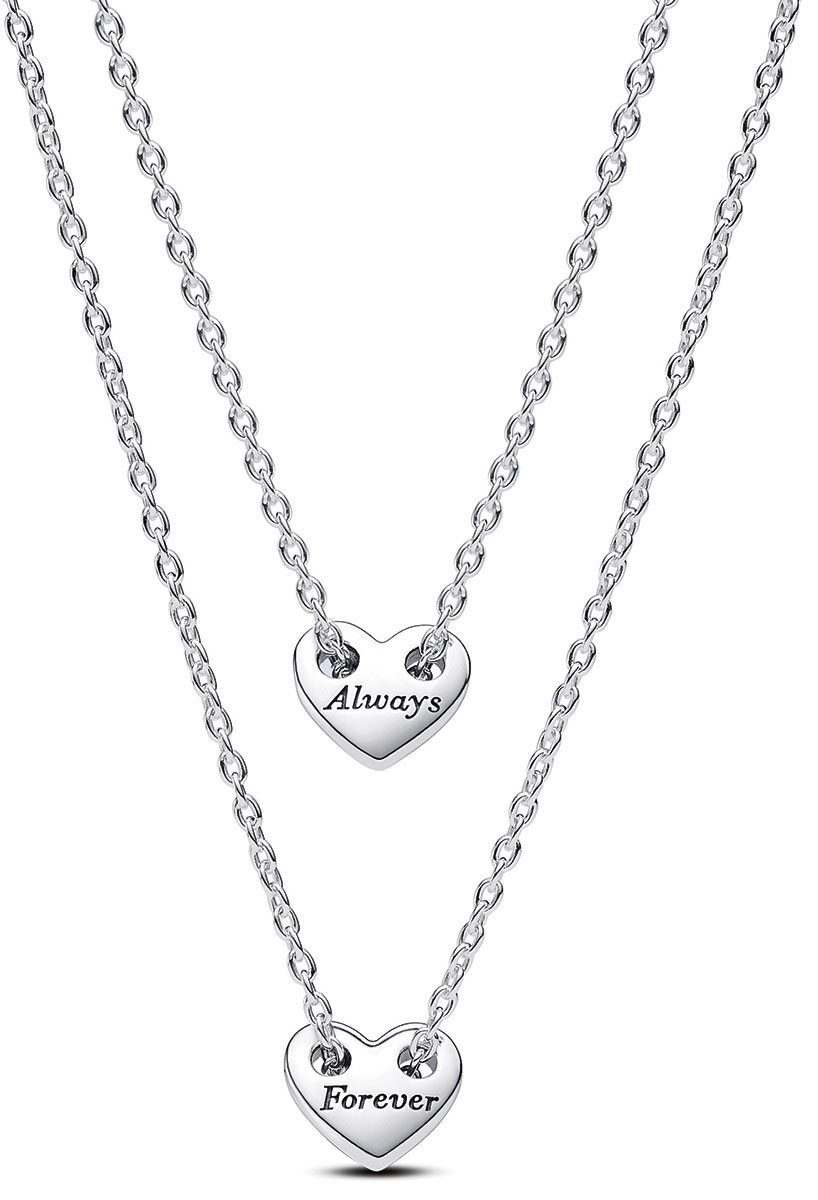 Pandora Forever & Always Splittable Heart 393207C00-45 sterling-hopeasta valmistetussa sydänkaulakorussa on kaksi sydänriipusta, joissa tekstit "Always" ja "Forever". Kaulakorua voi käyttää kerrostettuna, mutta sen voi myös irrottaa ja jakaa vaikka toisen osan läheisellesi. Hopeaketjun pituus on 45 cm.