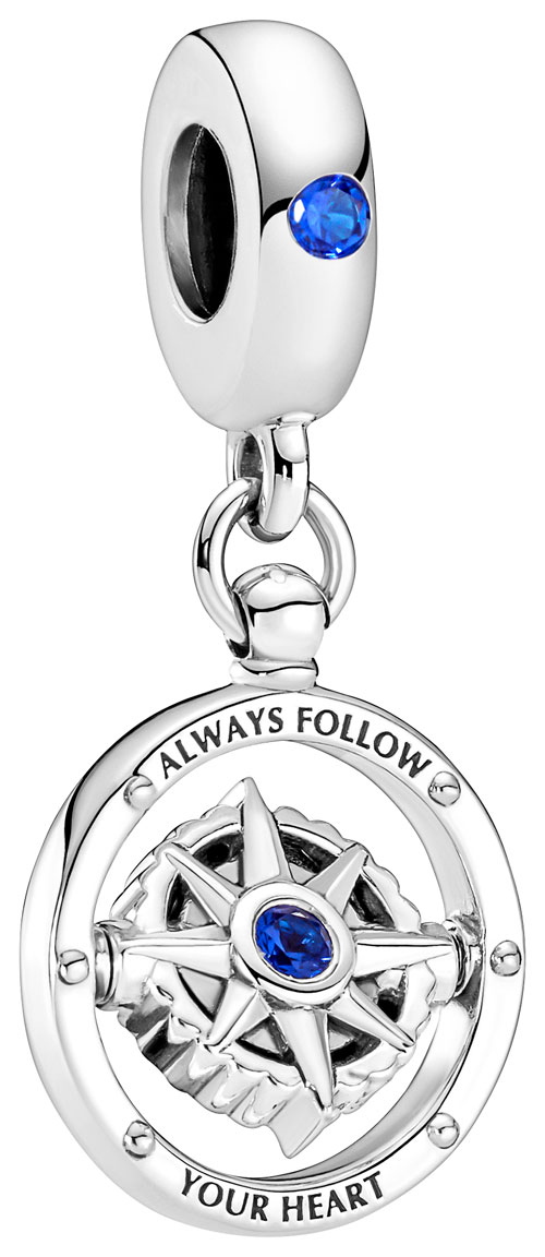 Pandora hela dangle Spinning Compass 790099C01 on kaunis kompassiteemainen hela, jota koristaa sininen synteettinen zirkonia ja teksti "Seuraa aina sydäntäsi". Materiaali: sterling-hopea. Pandora-korut toimitetaan valmistajan alkuperäisessä pakkauksessa.