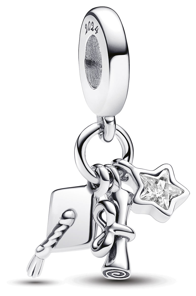 Pandora Moments 2024 Graduation 793240C01 sterling-hopeasta valmistettu hela on erinomainen lahja 2024 valmistuville opiskelijoille! Riippuvassa korussa on koristeena kolme eri kuviota; valmistujaislakki, stipendi/lopputodistus sekä säihkyvä tähti, johon on upotettu kirkas kuutioinen zirkonia.