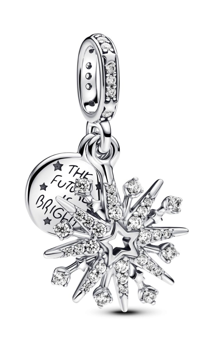 Pandora Moments Firework hopea double dangle clear cubic zirconia 793512C01 on sterling-hopeaa, ja helaa koristaa ilotulitusraketti, ja synteettinen zirkonia. Pandora-korut toimitetaan valmistajan omassa rasiassa.