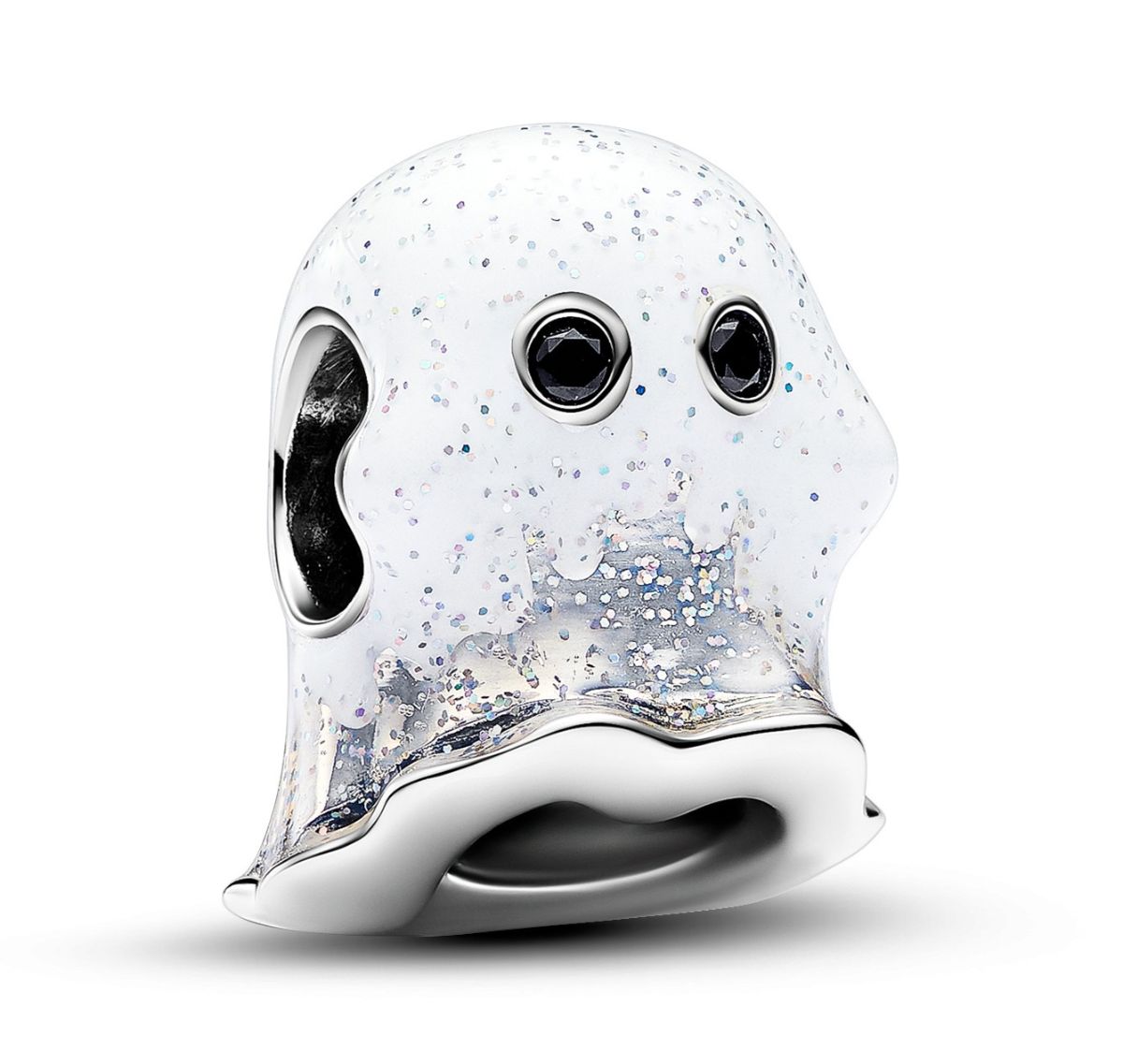 Pandora Moments Ghost sterling silver hela with black crystal and shimmering white glow in the dark enamel 793404C01 on täydellinen Halloween-koru. Tämä haamu on emaloitua sterling-hopeaa, ja pimeän tullen sen pinta loistaa pimeässä. Illan tullen koru loistaa pimeässä ja on siksi täydellinen asuste halloween-juhliin. Voit ripustaa korun esimerkiksi Pandoran kaula- tai rannekoruun.