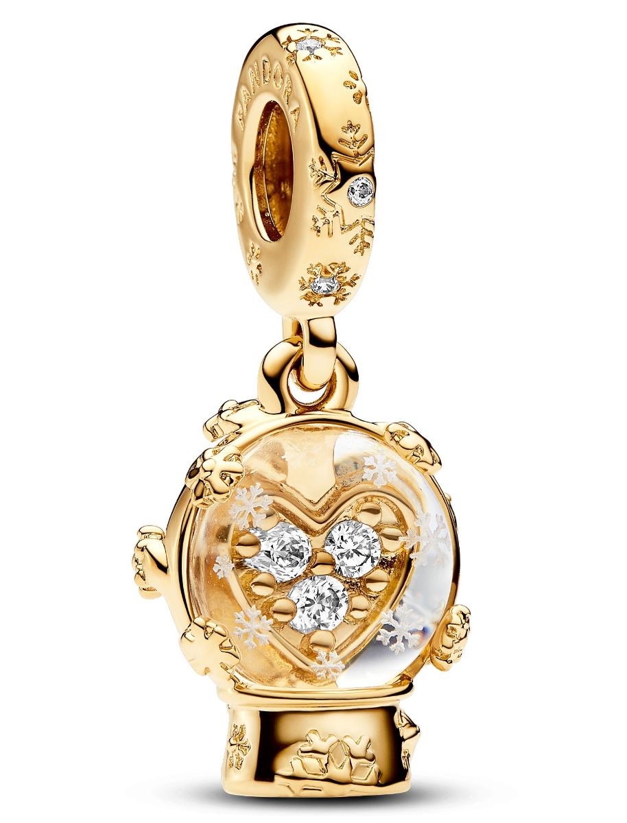 Pandora Moments Heart Snowflake Snow Globe 14k Gold-plated helassa 762825C01 on kuvattuna lumihiutalepallo ja se tuo kantajalleen ylellistä talven taikaa. Korussa on 14 karaatin kultaus ja ylellinen briljanttien zirkonioiden istutus.
