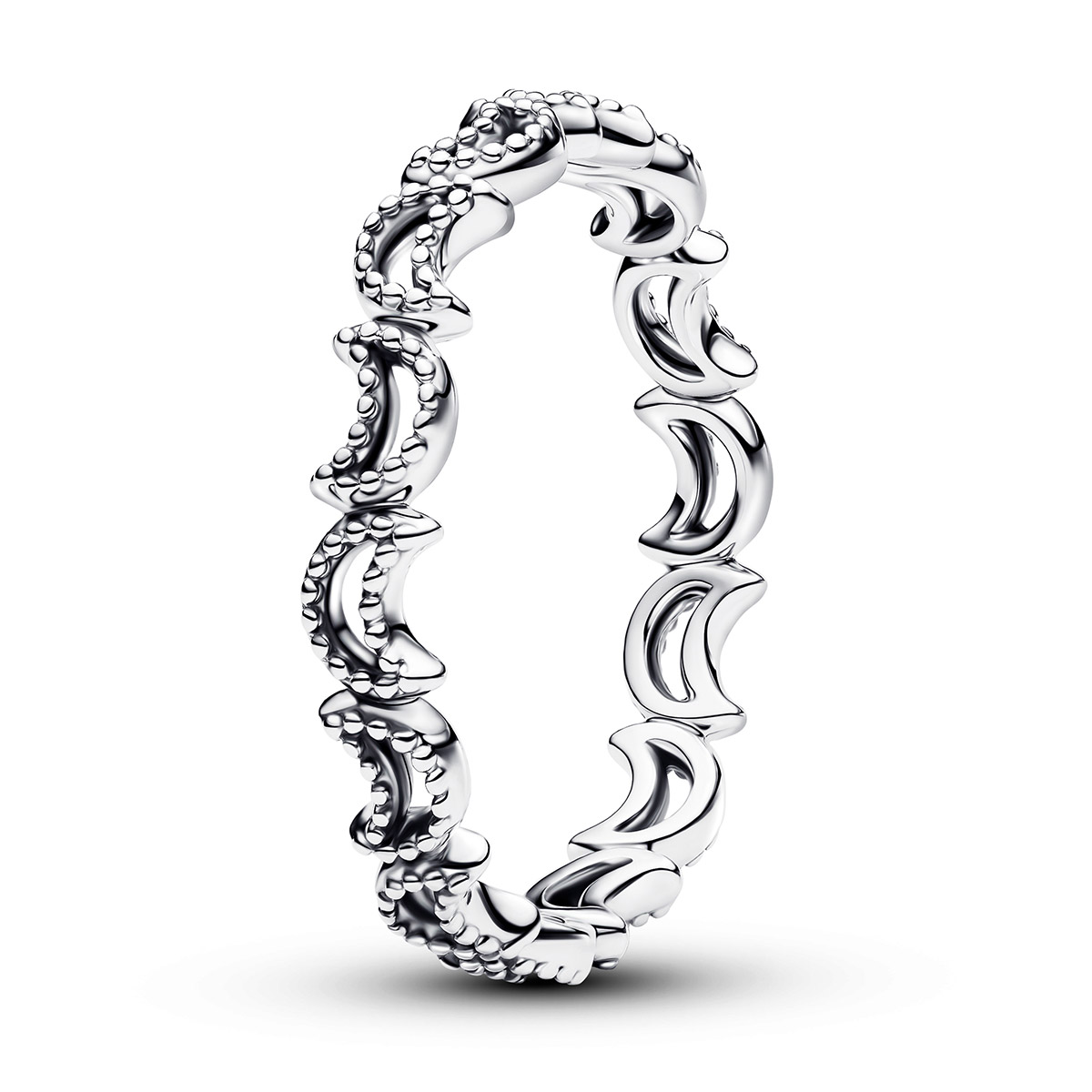 Sädehdi kuin yön taivas Pandora Moments sormuksella. Tämä tyylikäs sormus on valmistettu aidosta sterling-hopeasta, ja sen pinnalla kiemurtelee kuunsirppiä muistuttava koristekuvio, jota täydentävät pienet, helmiäismäiset yksityiskohdat. Muotoilu on inspiroitu kuun eri vaiheista – symboloiden muutosta, kasvua ja naisellista voimaa.