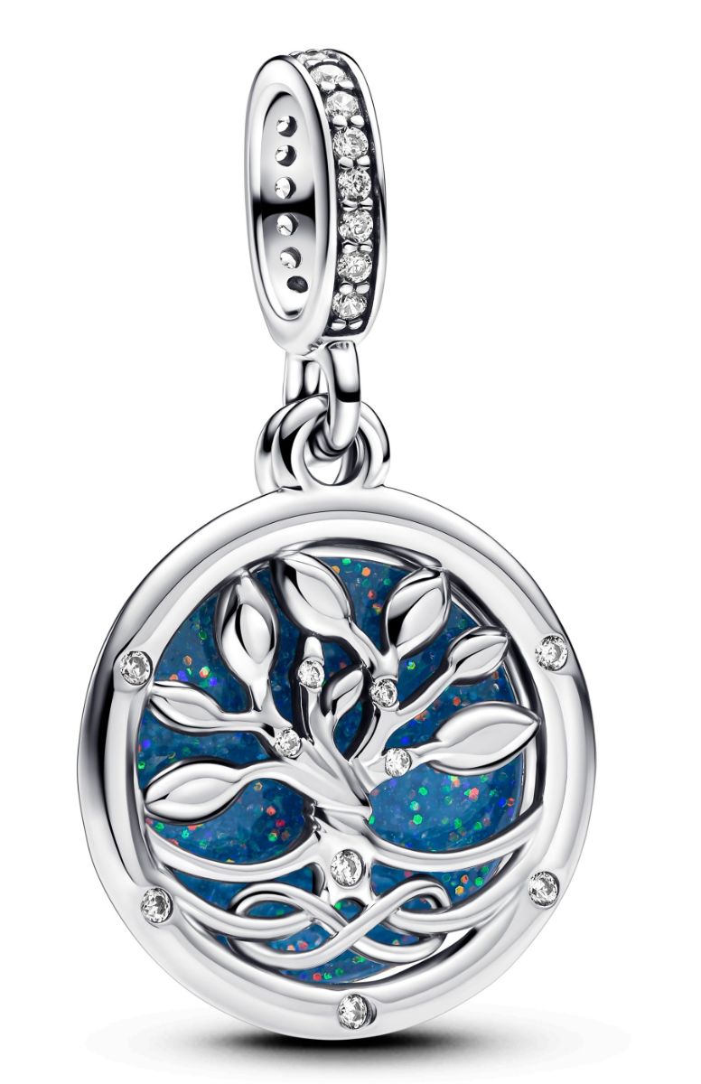 Pandora Moments Infinity tree hopea double dangle clear cubic zirconia glittery glow in the dark blue enamel 793599C01 juhlii perheen tuoman rakkauden merkityksellisyyttä. Koru on sterling-hopeaa, ja helaa koristaa synteettinen zirkonia ja värikäs, pimeässä hohtava emalointi. Etupuolella on lehvästö ja ikusuus-symboli. Takaa löytyy kaiverrus "Family is where loce grows". Anna koru lahjaksi itsellesi muistona perheestäsi, tai vaikka äitille äitienpäivälahjaksi. Pandora-korut toimitetaan valmistajan omassa rasiassa.