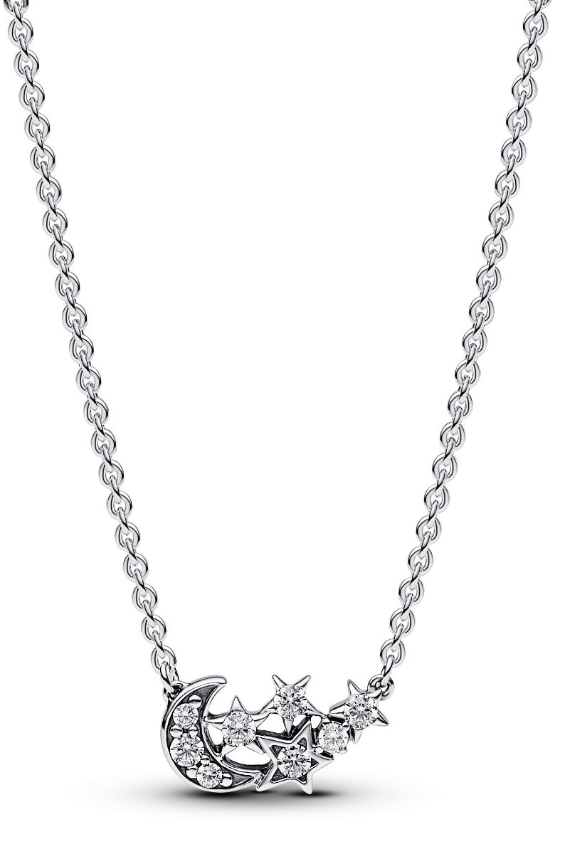 Pandora Moments Sparkling Moon & Star Sterling silver kaulakorussa 392991C01-45 hehkuu kuunsirppi ja tähti. Kaulakorussa usean kirkkaan zirkonian istutus, ja se ovat sterling-hopeaa. Ketjun pituus on 45 cm. Pandora-korut toimitetaan kauniissa lahjarasiassa.