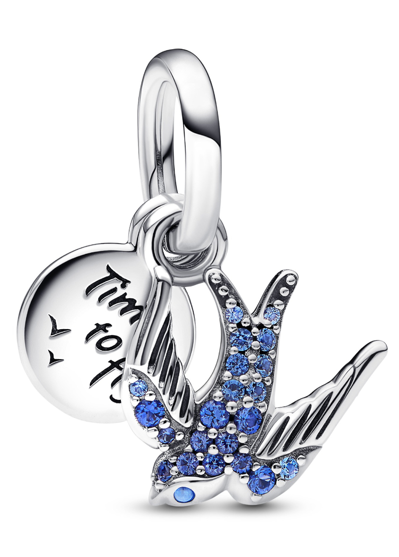 Pandora Moments Sparkling Swallow & Quote hela 792570C01 on koristeltu kirkkain kivin ja kauniin pääskysin, jotka tuovat kevään tullessaan. Korussa on useita sinisiä kristalleja, synteettisiä zirkonioita, ja runko on sterling-hopeaa.