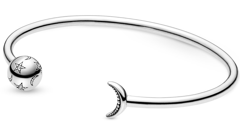 Hopeisessa Pandora Moon and Star Open Bangle rannekoru 599120C01-kaulakorussa on ainutlaatuinen tunnelma, ja taivaalla loistaa puolikuu. Tätä uniikkia avorannekorua voi käyttää sellaisenaan tai lisätä rannekkeeseen juuri itselle sopivia heloja avaamalla tähtihelan takan oleva nuppilukko. Helat myydään erikseen. Pandora-korut toimitetaan valmistajan alkuperäisessä pakkauksessa.