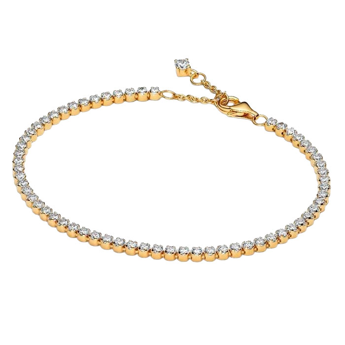 Pandora Timeless 563927C01 on ajaton ja elegantti tennisrannekoru, jonka virtaviivainen muotoilu tekee siitä täydellisen valinnan niin arkeen kuin juhlaan. Koru on valmistettu 14k kultapinnoitetusta metallista ja se on kauttaaltaan koristeltu kirkkailla zirkoniakivillä, jotka on istutettu siroihin kiinnityksiin. Yhtenäinen kivirivi kiertää ranteen sulavasti ja jatkuu aina lukkoon asti, luoden yhtenäisen ja ylellisen ilmeen. Jokainen kivi heijastaa valoa kauniisti, tuoden koruun jatkuvaa, hienovaraista kimallusta. Syvyys 2 mm ja korkeus 2,45 mm.