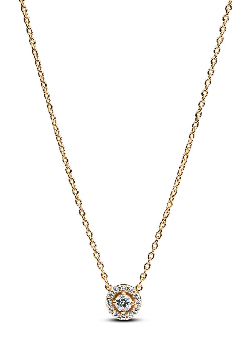 Pandora Timeless Round Pavé Halo Pendant 363548C01-45 kaulakoru viimeistelty 14-karaatin kullalla, ja korussa on elegantti haloriipus, jossa kimaltaa kymmenittäin kirkkaita zirkonioita kauniissa halo-istutuksessa. Koru on herkkä, klassinen ja ajaton, ja se kruunaa sekä arki, että juhlatyylin. Pandora-korut toimitetaan valmistajan omassa rasiassa.